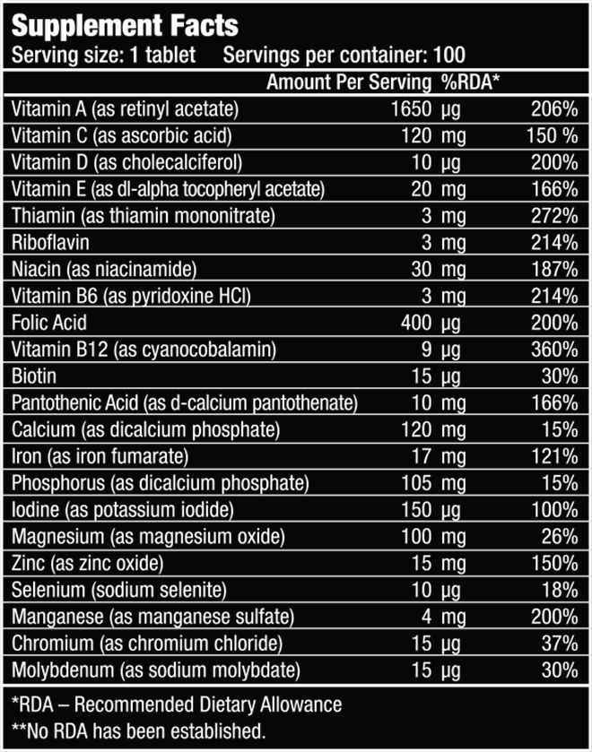 Zutaten: Füllstoffe (mikrokristalline Cellulose, Hydroxypropylmethylcellulose), Dicalciumphosphat, Magnesiumoxid, L-Ascorbinsäure, Eisenfumarat, DL-α-Tocopherylacetat, Nicotinamid, Trennmittel (Magnesiumstearat, Stearinsäure), Zinkoxid, Retinylacetat, Mangansulfat, Calcium-D-Pantothenat, Cholecalciferol, Thiaminmononitrat, Pyridoxinhydrochlorid, Riboflavin, Farbstoff (Eisenoxid gelb), Pteroylmonoglutaminsäure, Kaliumiodid, Chromchlorid, Natriummolybdat, Natriumselenit, D-Biotin, Cyanocobalamin.