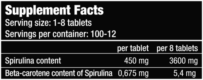 Zutaten: Spirulina platensis Algenpulver (450 mg / Tablette), Maltodextrin, Trennmittel (Siliciumdioxid, Magnesiumstearat), Überzugsmittel [Glanzmittel (Hydroxypropylmethylcellulose)]